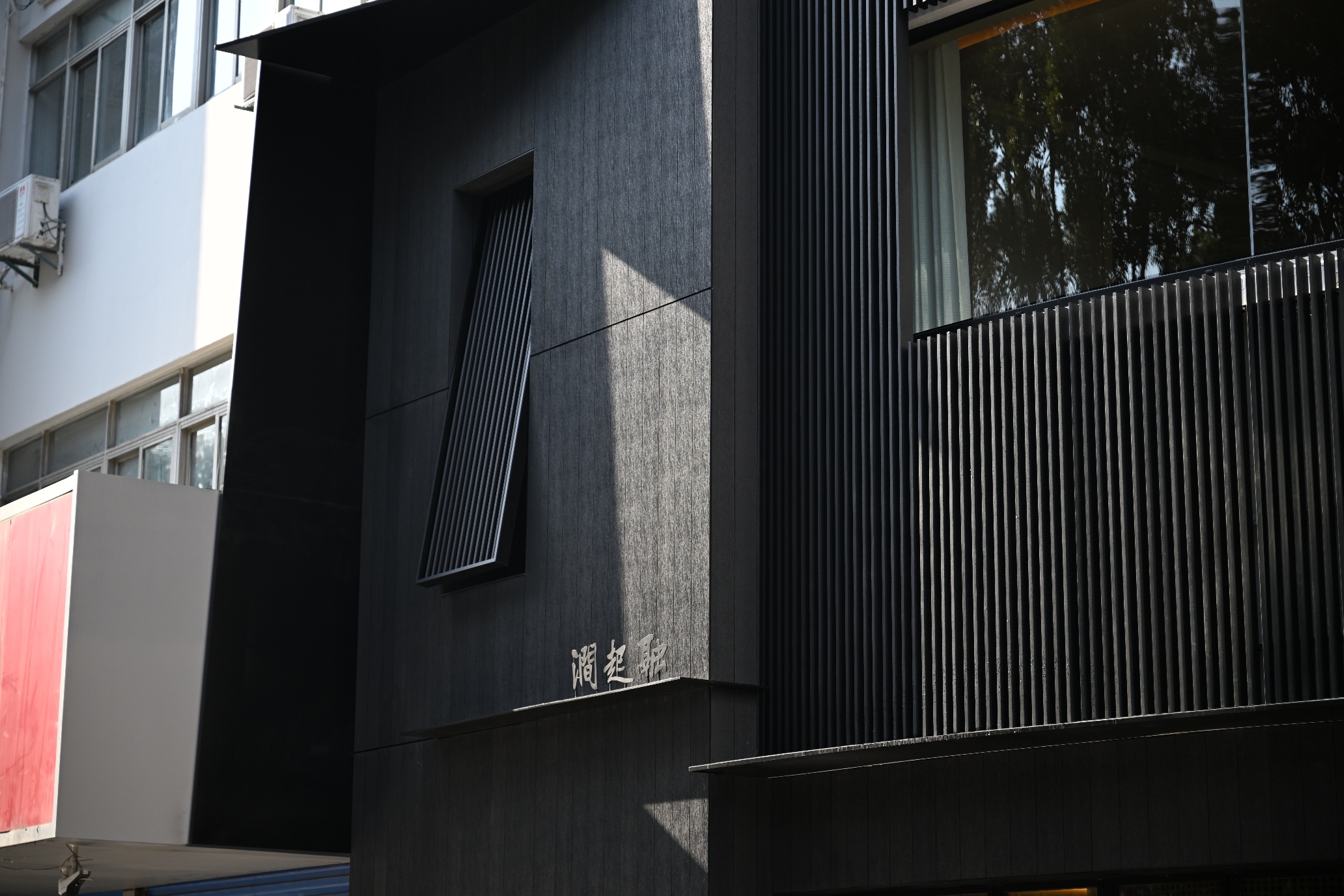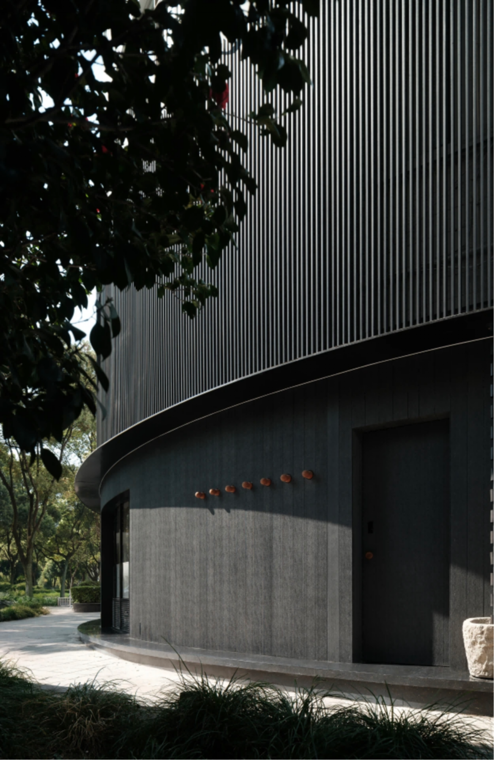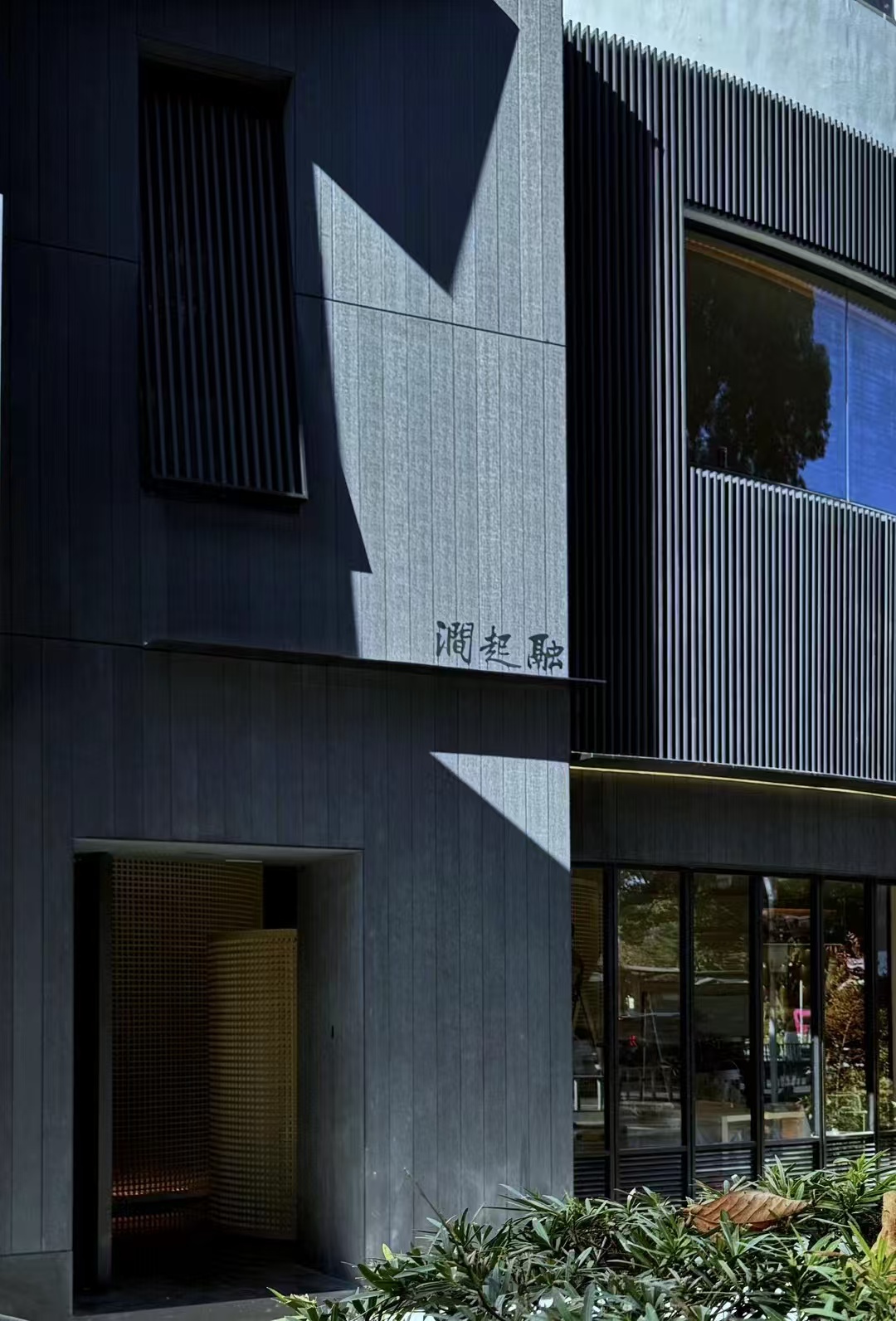Light and breeze filter through a graded porosity, translating a charred-wood tone into a quietly contemporary Eastern facade.